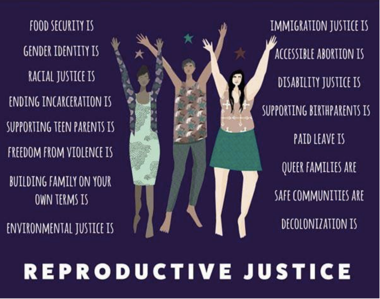 Birth as reproductive JUSTICE - supportING the ability of people to make decisions regarding whether to have a child, when to have a child, where to have a child, with whom to have a child and in what manner. Informed consent in all health care decisions is paramount to this process. This ALSO means ensuring that WE have access to health care that is not racist or sexist, to sex POSITIVE education, contraception, menstrual supplies, abortion, midwives, OB/GYNs, doulas, healthy food, and the freedom to safely express OUR gender and sexuality in a manner that feels joyous.